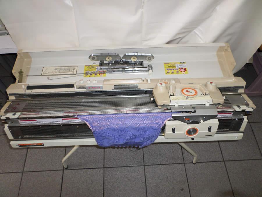 Máquina de tejer marca Singer modelo MEMO- MATIC 323 (para lana de madeja - Galga 5) tarjetera, con pretinadora marca Singer marca SRP-50, mueble y accesorios completos.
